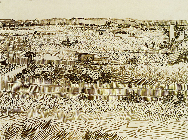 Drawing landscapes with a bamboo pen & ink in the style of Van Gogh